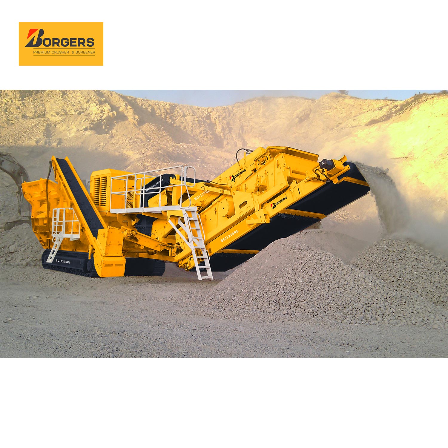 The Borgers BGI1270RS tracked impact crushers provides the versatility of a crushing and screening plant on one machine. Based on the Borgers BGI1270 the machine features an innovative quick detach 4270mm x 1520mm (14’ x 5’) single deck screen for sizing and recirculating oversize material back to the crushing chamber. The sizing screen can be quickly removed for applications that do not require resizing or recirculation of materials for further processing.